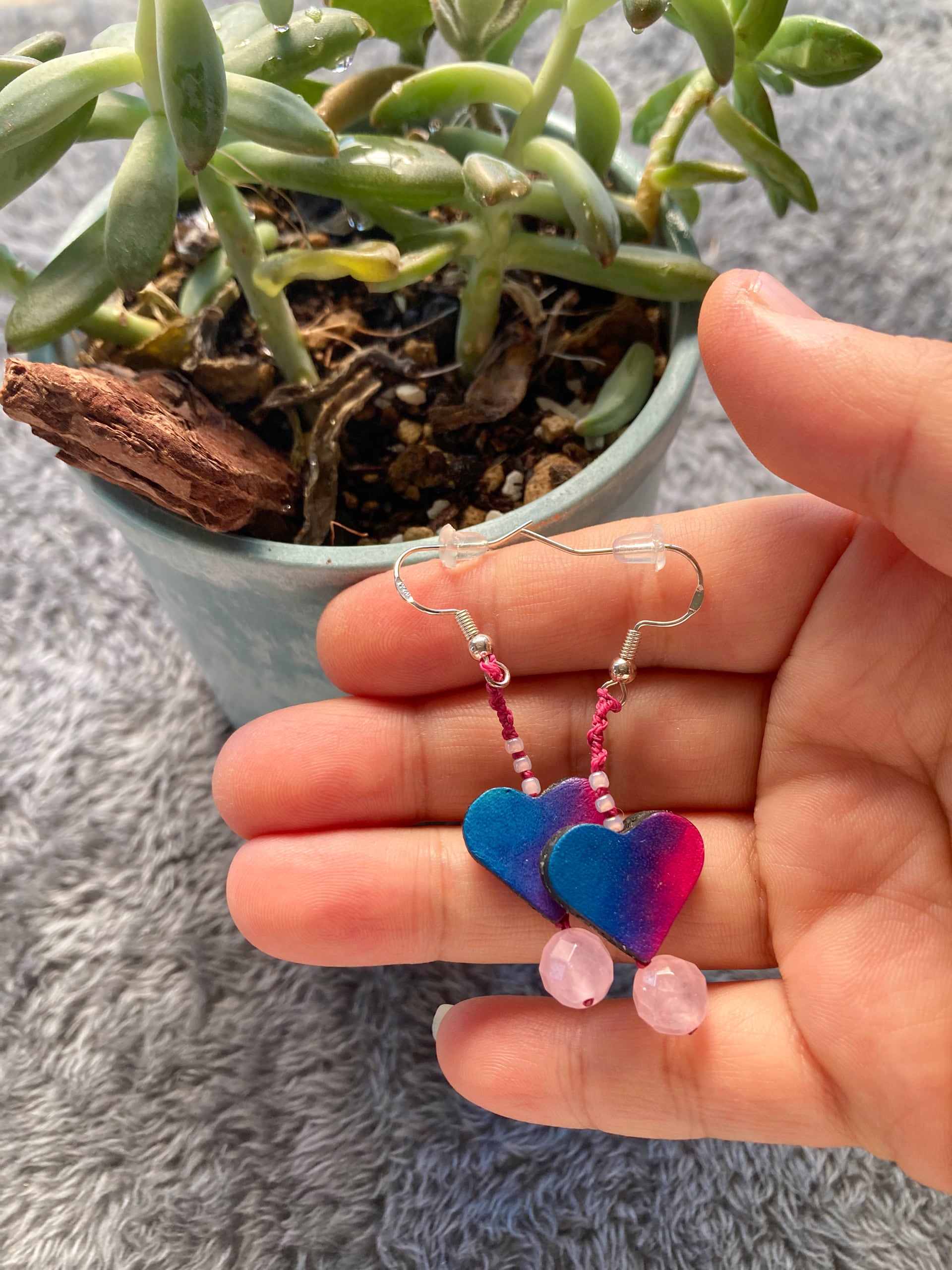 こんにちは、引き続きクリスマス限定商品のご紹介を致します。限定ということも有り、主人のレザークラフトとコラボ致しました。こちらもグラデーションしだてでハートの中に小さなオーロラを詰めたように仕上がってます。又カットされたローズクォーツを使用しており光に当たるとキラキラと優しい光を反射して耳元を明るくしてくれます。軽量の為ストレスなく身につけれると思います。他にもステンレスを使用しておりますので、アレルギーの方でもお気軽に使用できます。