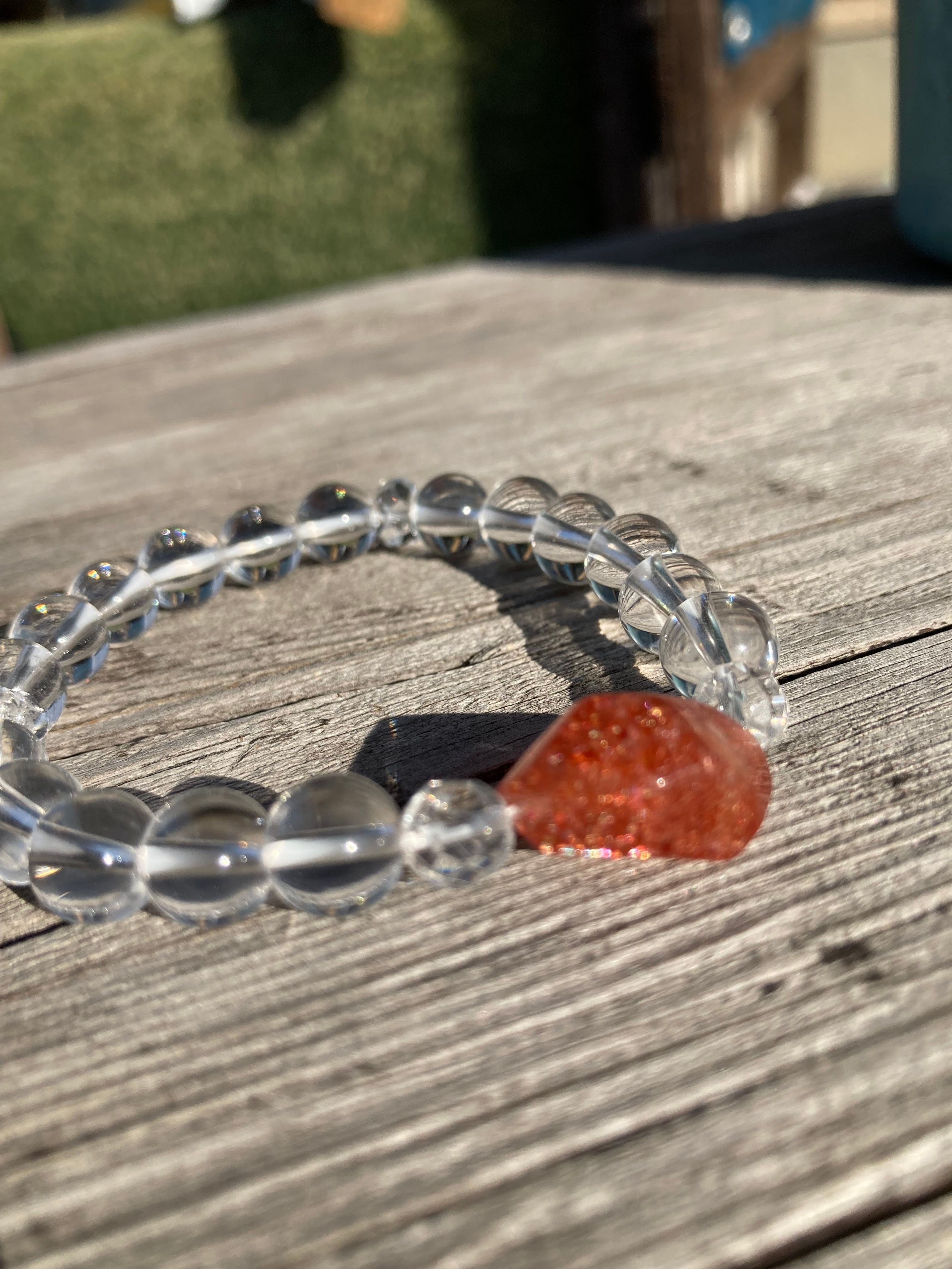 サンストーンと水晶のブレスレットです。水晶のクリアーな色にオレンジ色が引き立つブレスレット、ラメのようにキラメキとまるで小さな太陽を閉じ込めた見たいです。